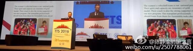 黄洁夫教授的演讲说出了我们器官移植界的心声,现场聆听有扬眉吐气之感,他的PPT用了中国女排教练郎平对中国器官捐献的支持照片。他详细介绍我国器官捐献发展之路,我国的公民心脑死亡器官捐献的体系尤如一个新生婴儿在逐渐的发展壮大,他再次对世界同行宣布中国自2015年1月全面取消应用死囚器官,将公民心脑死亡爱心捐献器官作为唯一来源,希望国际社会支持并监督中国的器官捐献及移植事业的发展,他演讲结束得到了全场热烈的掌声。